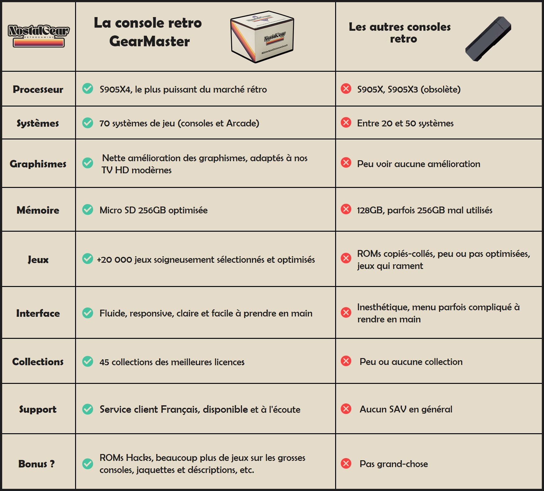 « Mais qu’a-t-elle de plus que les autres ? » La GearMaster est LA console rétrogaming de salon la plus puissante dans sa gamme sur le marché français. Et elle ne va pas claquer dans 2 mois.